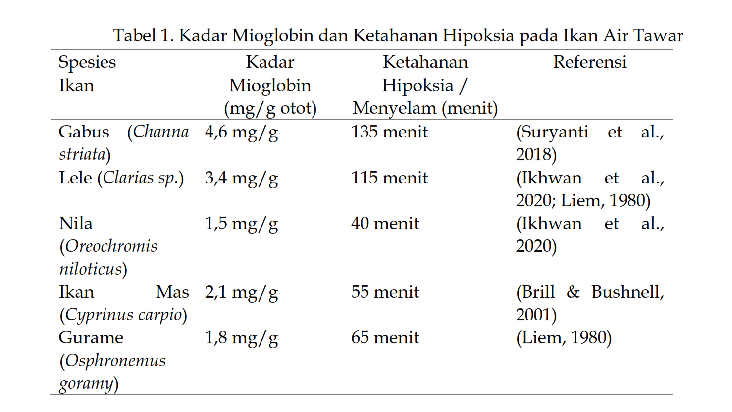 Ikhwan, M., Rahmadi, S., & Putra, A. (2020). Muscle myoglobin concentration and habitat oxygen fluctuation in freshwater fish species. Journal of Aquatic Biology, 5(1), 45–52.