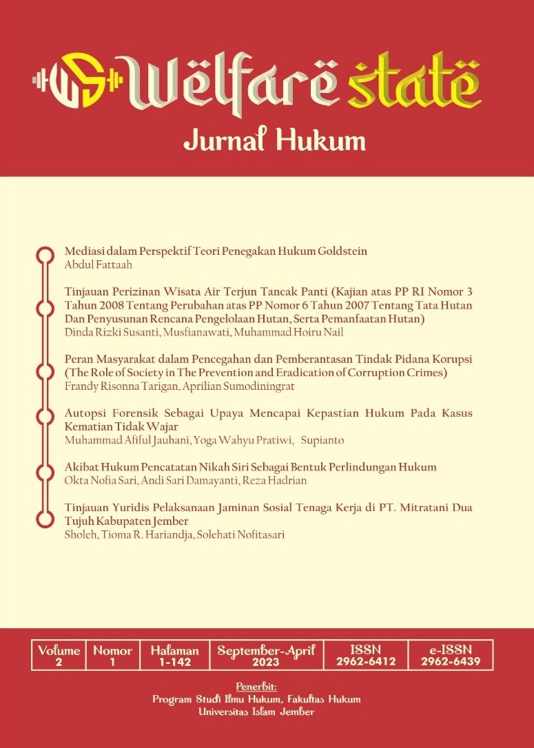 Welfare State Law Journal is a scientific journal published periodically by the Law Studies Program, Faculty of Law, Islamic University of Jember. The Welfare State Law Journal was formed with the aim of being an effective means of improving the culture of research and publication of scientific work for legal academics and practitioners that is in accordance with national quality standards. Welfare State Law Journal is published periodically twice a year, namely in April and October with 6 articles in each issue number. The study focus of the Welfare State Journal of Law covers major legal issues both in Indonesia and internationally in the scope of Civil Law, Criminal Law, Corporate Law, Criminal Justice Policy and Law, Constitutional Law, Human Rights Law, Administrative Law, Environmental Law, Land Law , Intellectual Property Law, Information Technology Law, International Law, Islamic Law, Legal Principles and Theory, Legal Research Methodology, and Arbitration and Alternative Dispute Resolution